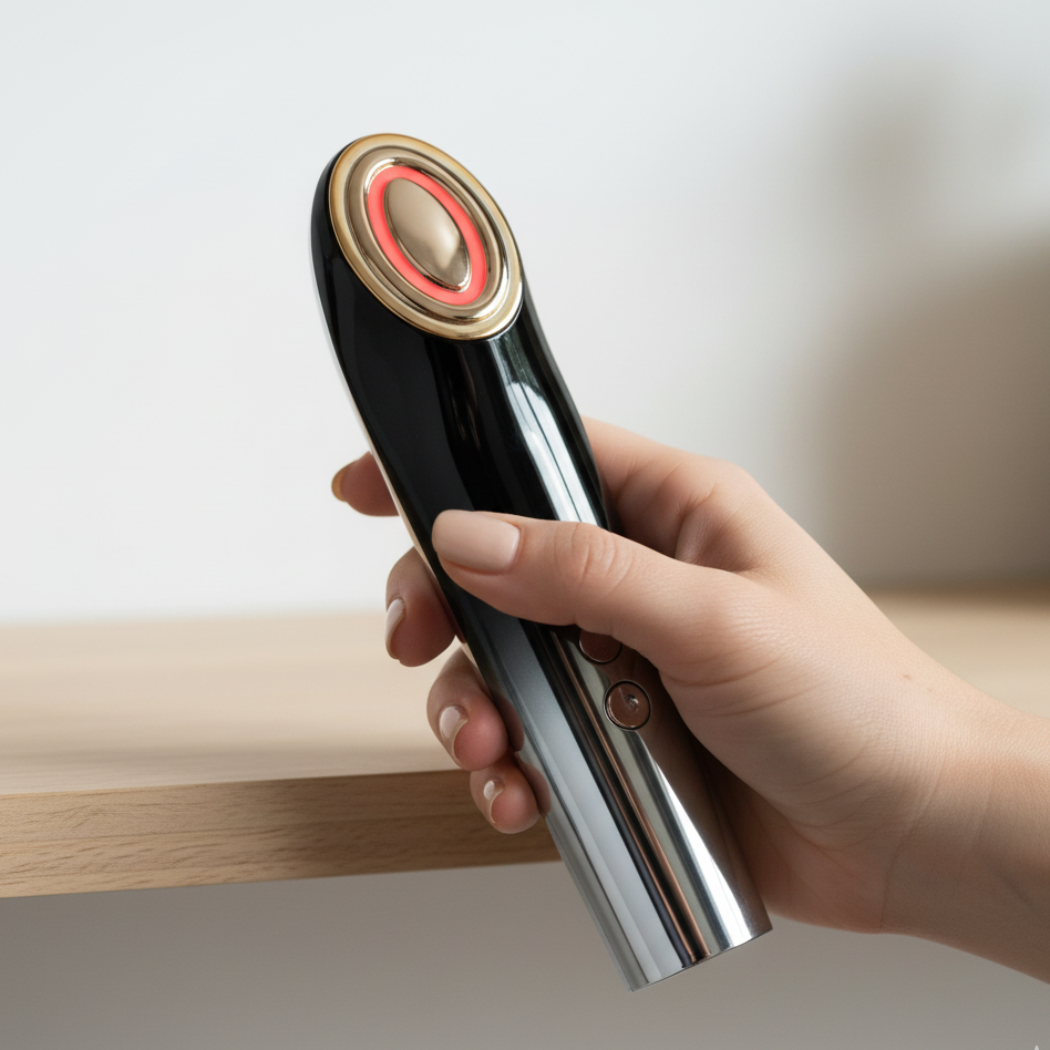 O Glowy Firm Booster é um dispositivo multifuncional desenvolvido para elevar sua rotina de skincare. Ele combina microestimulação EMS, terapia de luz LED vermelha, massagem sônica e modos de calor/frio que juntos promovem a firmeza da pele, reduzem linhas finas e aumentam a absorção dos seus produtos favoritos.